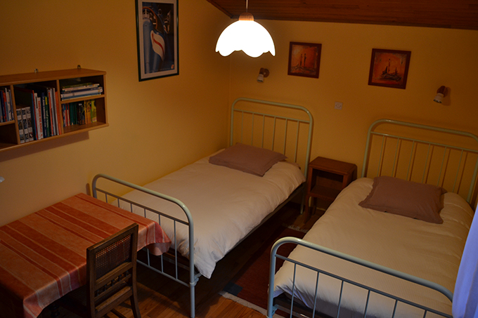 La deuxième chambre donne également sur le balcon. On y trouve deux lits, une armoire et un petit coin bureau avec une étagère de livres et de revues "jeunesse". Idéal pour les enfants!